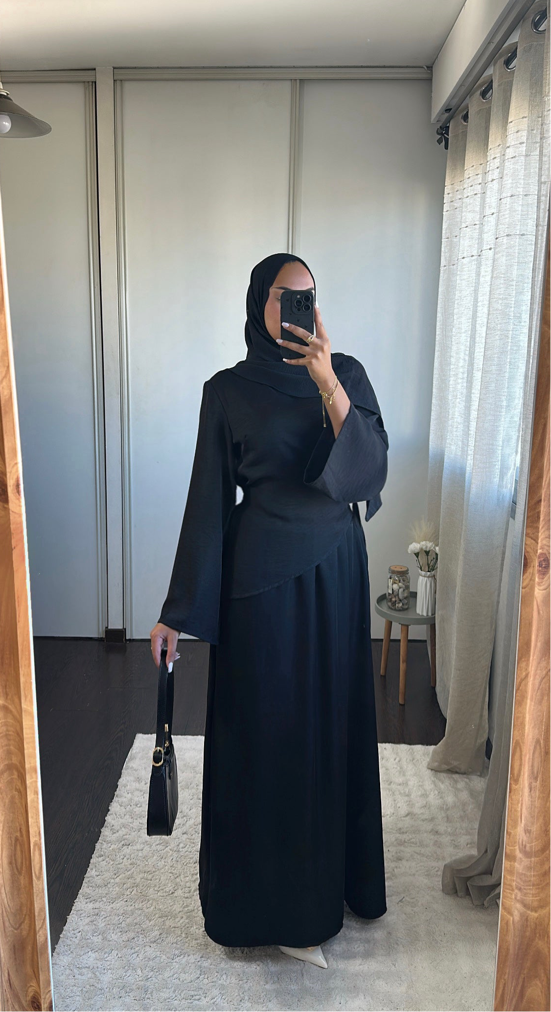 •Ensemble deux pièces raffiné composé d’une jupe longue fluide et top asymétrique